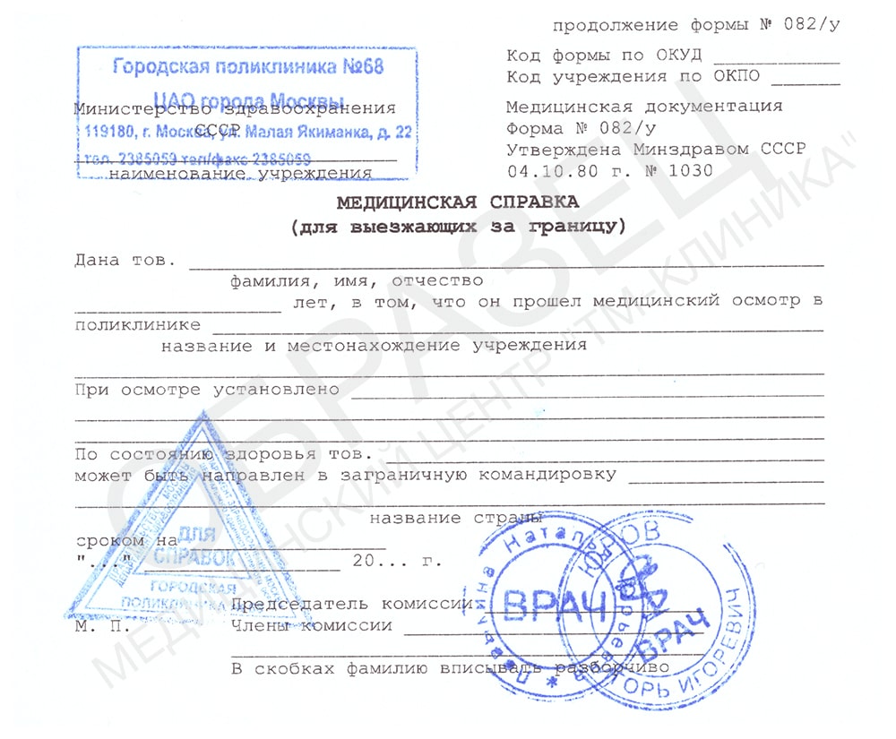 Однако, не стоит переживать! Если вам нужно срочно отправиться за рубеж, а медицинское заключение отсутствует, вы можете купить справку 082у в нашем центре в Москве. В течение дня обращения вам будет оформлен документ на бланке установленного образца с подписями всех специалистов, результатами анализов и сведениях о прививках. О подлинности справки вы можете не беспокоится – она пройдет любую проверку, будет принята на таможне, в страховой зарубежной компании, посольстве или консульстве.