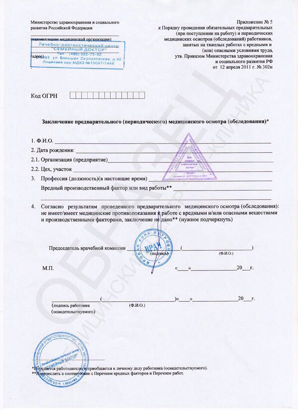 При необходимости назначаются дополнительные обследования, если есть подозрение, что производственные факторы повлияли на здоровье работника. Паспорт здоровья работника формы 302Н оформляется на нескольких бланках, где указываются данные пациента, заключение о его здоровье, диагнозы, если они есть, подписи, печати врачей, дата. При наличии патологии назначается соответствующее лечение. Срок действия документации – два года, после чего осмотр нужно проходить снова. На некоторых предприятиях обследования проводятся каждый год.